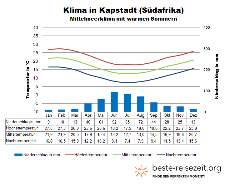 Winter (Juni bis August): Die Winter in Kapstadt und im Westkap sind mild und feucht. Die Tagestemperaturen liegen normalerweise um 18 °C, die Nächte sind mit 7 bis 8 °C jedoch kühl. Dies ist die Hauptregenzeit in der Region.