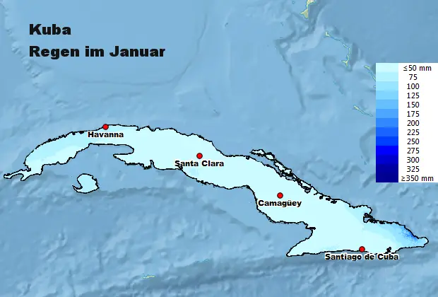 Höchster Niederschlag im Januar: 185 mm, an der Südostküste Kubas (im Osten von Santiago de Cuba)