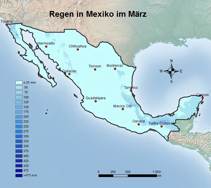 Geringste Niederschlagsmenge im März: 0 mm, weite Teile der Pazifikküste südwestlich von Oaxaca und der südöstliche Zipfel der Halbinsel Baja California.