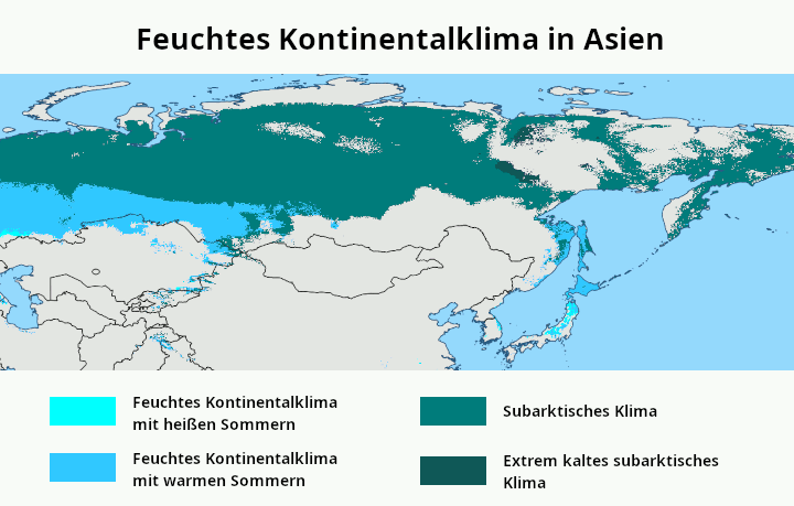 - Extrem winterkalt und extrem kontinental: Der kälteste Monat liegt unter −38 °C.