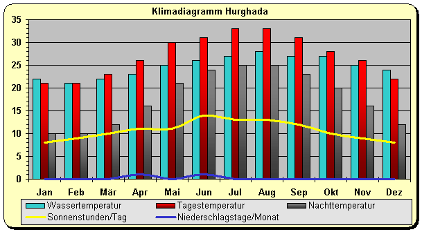 Hurghada die sommerliche durchschnittliche Maximaltemperatur bei 37 bis 38 °C, nachts sinkt die Temperatur auf 28 °C. Im Januar erreichen die Tageshöchstwerte 22 °C, die Nachttemperaturen sinken auf 11 bis 12 °C.