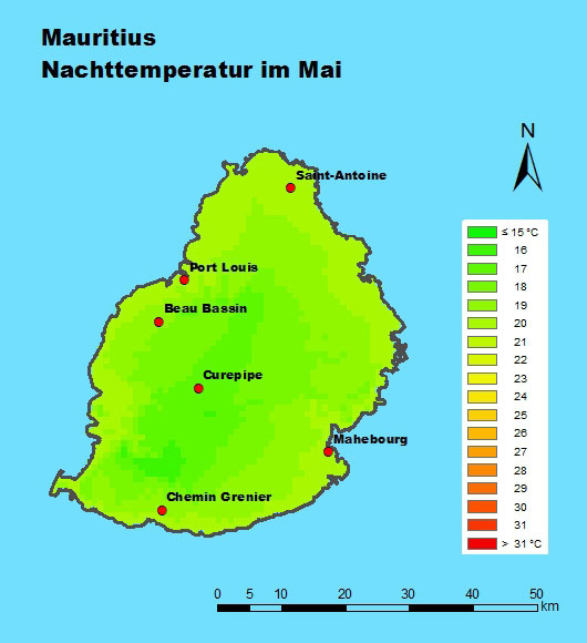 Höchste monatliche Nachttemperatur im Mai: 19,6 °C, an Teilen der westlichen und nördlichen Küste, nordöstlich und südwestlich von Port Louis, sowie nördlich von Saint-Antoine