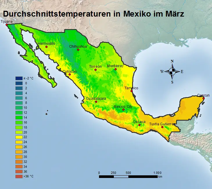 Geringster Wert für die monatliche Höchsttemperatur im März: 4,6 °C, um den 5610 m hohen Berg Citlaltépetl (auch bekannt als Pico de Orizaba) und um den 5462 m hohen Popocatépetl, beide östlich von Mexico City. Kalt bleibt es auch bis zu 3000 m hohe Sierra Madre Occidental im Norden Mexikos.