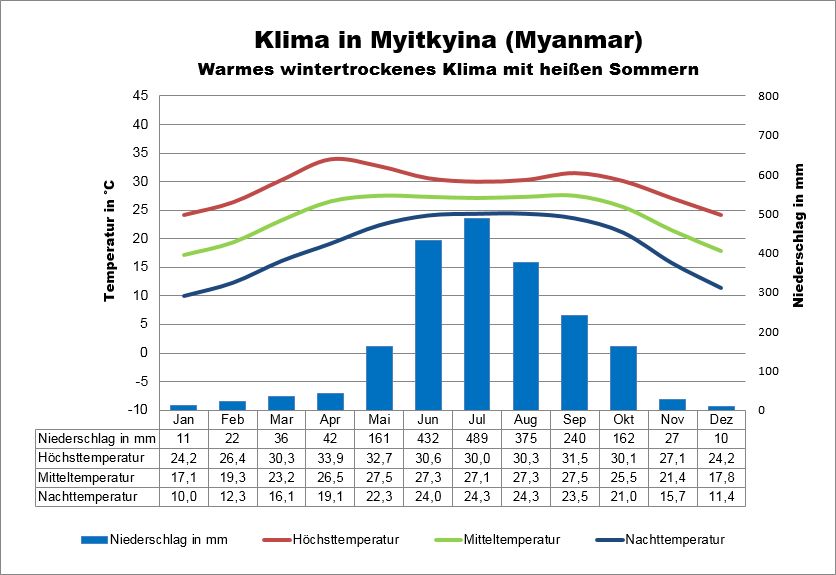 Im größten Teil von Myanmar herrscht tropisches Klima mit drei Jahreszeiten, die durch den Wechsel der Monsunwinde hervorgerufen werden. Im Nordosten von Myanmar ist subtropisches Klima bestimmend.