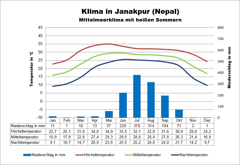Im Januar herrscht in Nepal Winter. Im Hochgebirge dominieren Dauerfrost und Neuschnee. Nachts wird es hier bitterkalt. Auch im Vorhimalaya und im Flachland muss gelegentlich mit Temperaturen von nur um die 0 °C gerechnet werden. Schnee oder Regen sind aber nicht zu befürchten. Die Tagestemperaturen liegen allerdings um die 21 °C. Nachts und morgens ist es teilweise neblig. Doch nachdem dieser sich aufgelöst hat, ist es sehr klar und es bestehen hervorragende Sichtverhältnisse.