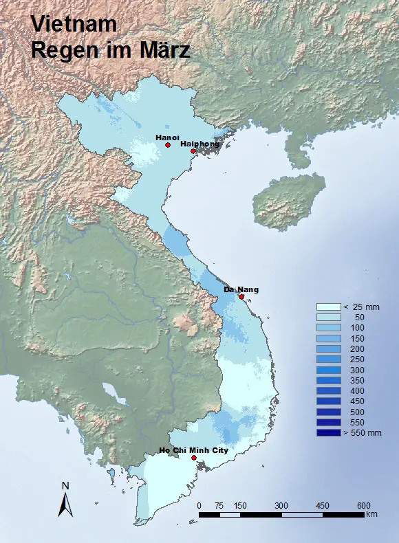 höchster Niederschlag im März: 149 mm, etwa 200 km nordöstlich von Ho-Chi-Minh-City, im Gebiet um den Berg Bonom Mhai (1.642 m Höhe)