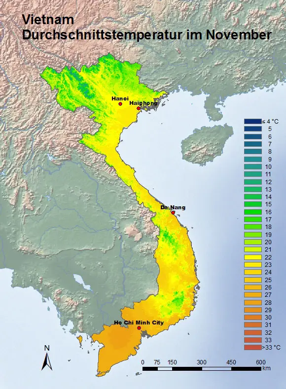 Geringste Niederschlagsmenge im November: 6 mm, im nordwestlichen Vietnam, im Hoang-Lien-Gebirge etwa 200 km nordwestlich von Hanoi