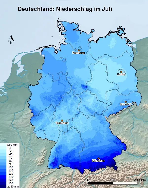 höchster Niederschlag im Juli: 180 mm, in den Berchtesgadener Alpen im Südosten Bayerns