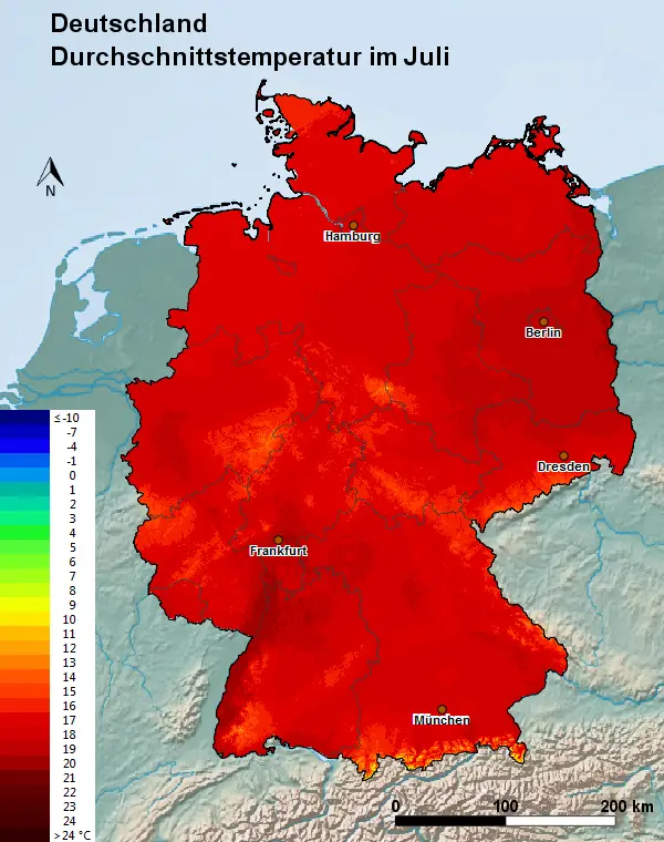 höchste durchschnittliche Temperatur im Juli: 19,8 °C, im Oberrheintal im westlichen und nordwestlichen Baden-Württemberg. Fast genauso warm ist es im Juli im östlichen Brandenburg an der Grenze zu Polen.