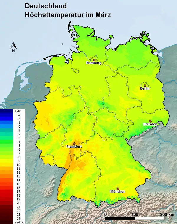 höchste durchschnittliche Temperatur im März: 7,4 °C, im Niederrheintal im südwestlichen Nordrhein-Westfalen