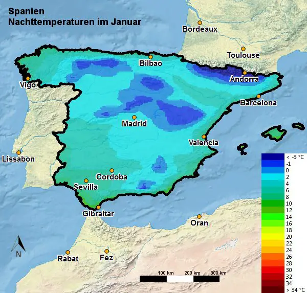 Die durchschnittliche Höchsttemperatur in Madrid im Januar beträgt 8,5 °C, die durchschnittliche Mindesttemperatur liegt etwas über dem Gefrierpunkt (1,5 °C).