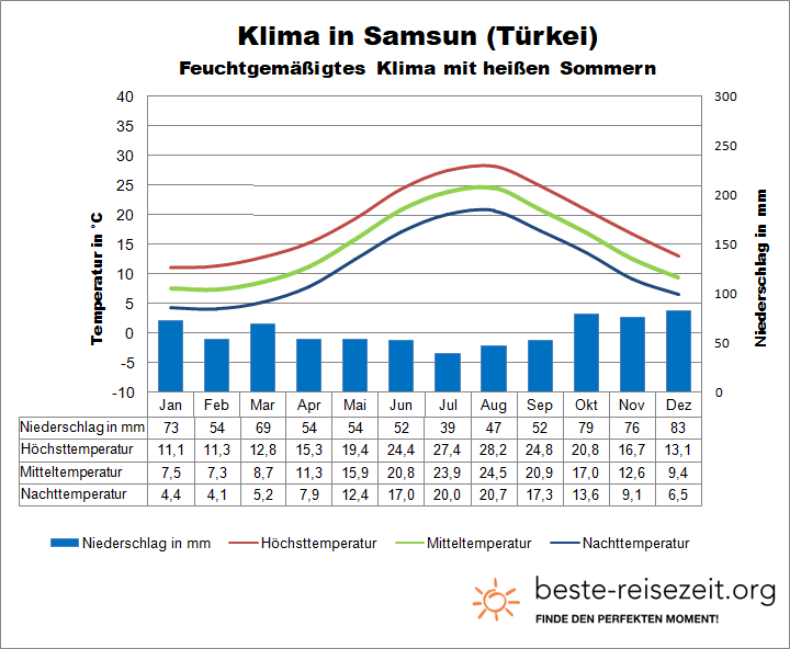 Die jahreszeitlichen Temperaturunterschiede im feuchtgemäßigten Klima in Samsun an der türkischen Schwarzmeerküste sind kleiner als in türkischen Städten im Landesinneren oder an der Mittelmeerküste. Der Regen ist relativ gleichmäßig über das Jahr verteilt.